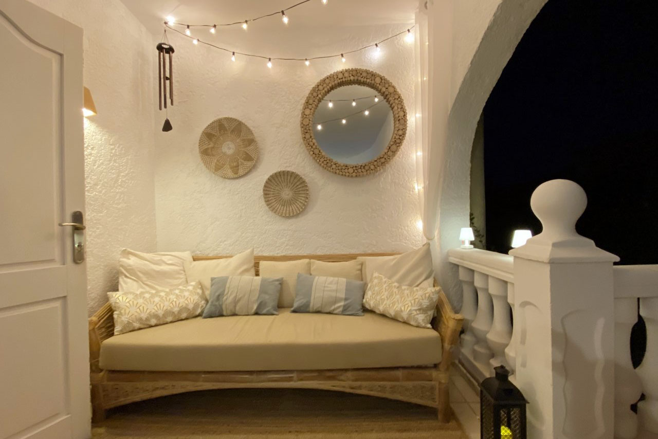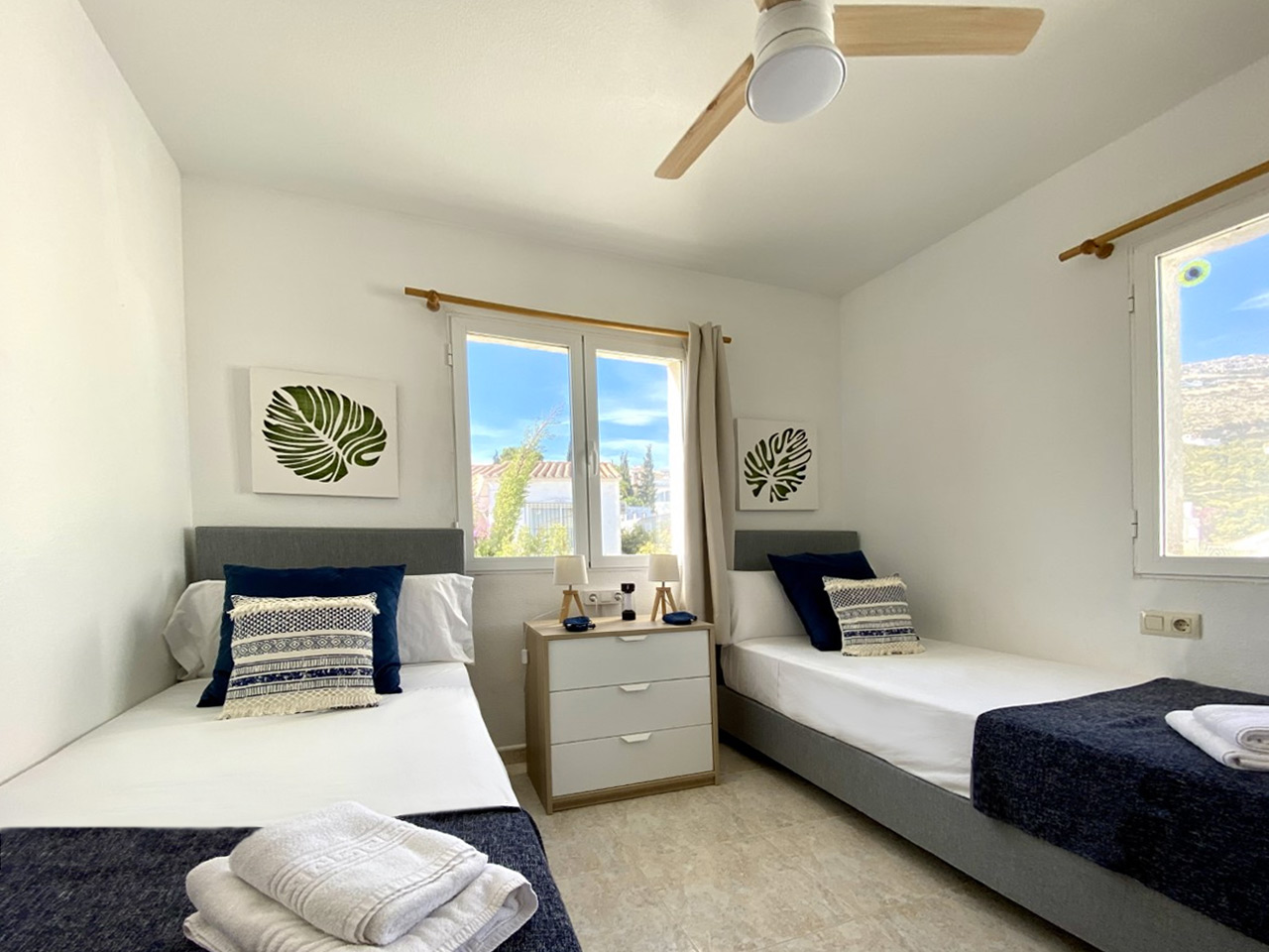 A l'étage supérieur de la villa il y a deux chambres et une salle de bain avec douche, l'une des chambres dispose de 2 lits simples et l'autre d’un lit double. Une des chambres, vous offrira une belle vue sur la mer ainsi que l'accès à une magnifique terrasse privée avec un canapé où vous pourrez profiter d'une vue superbe sur la mer.